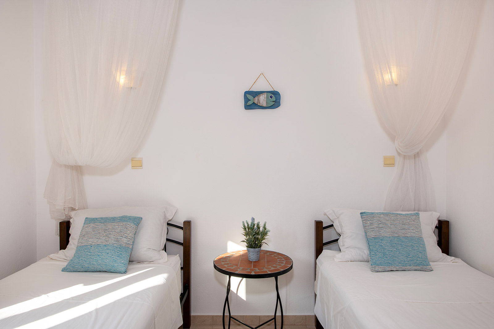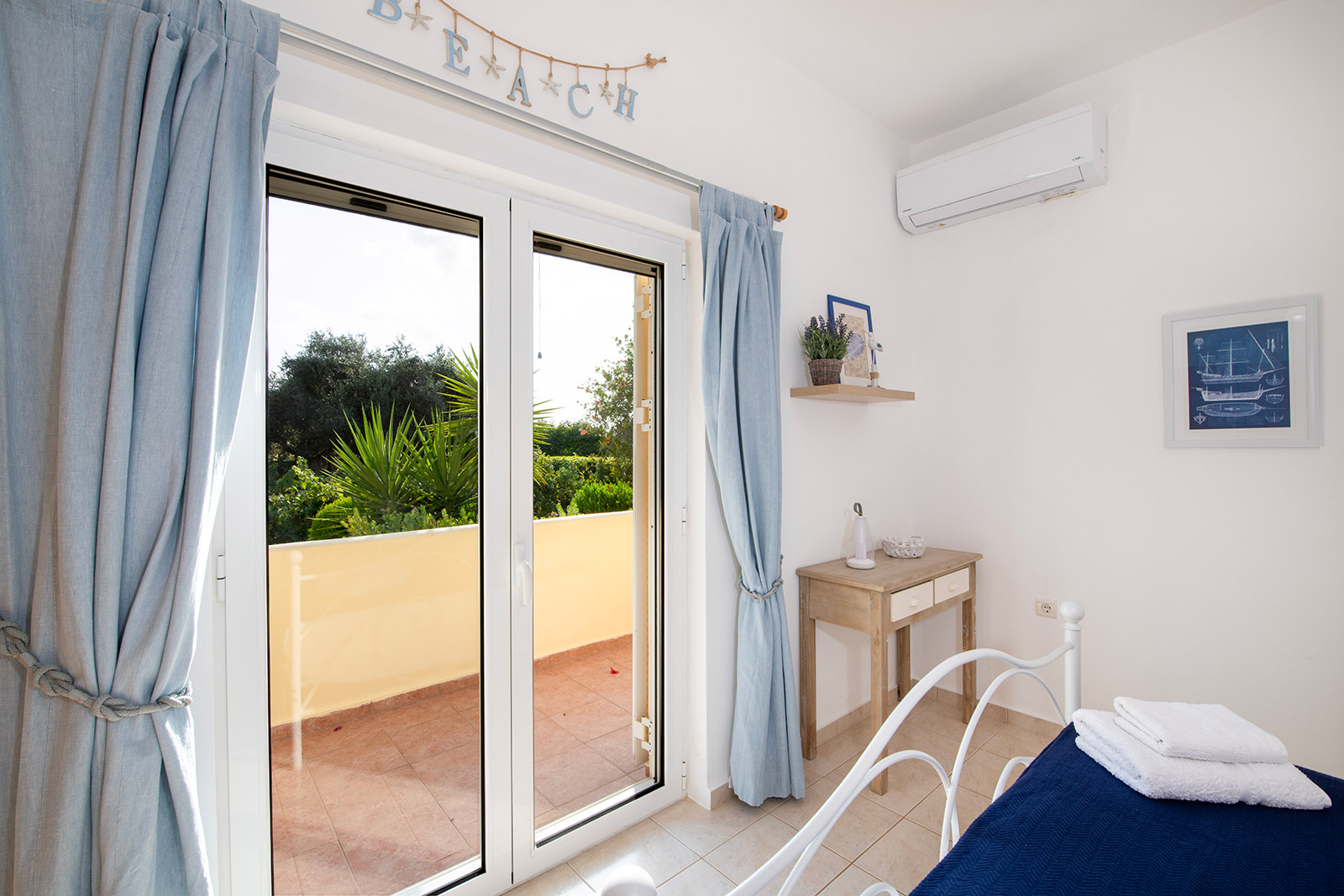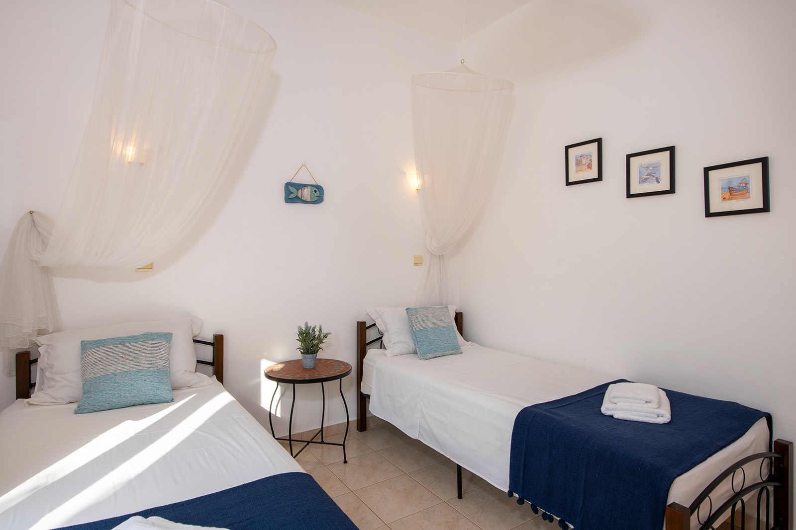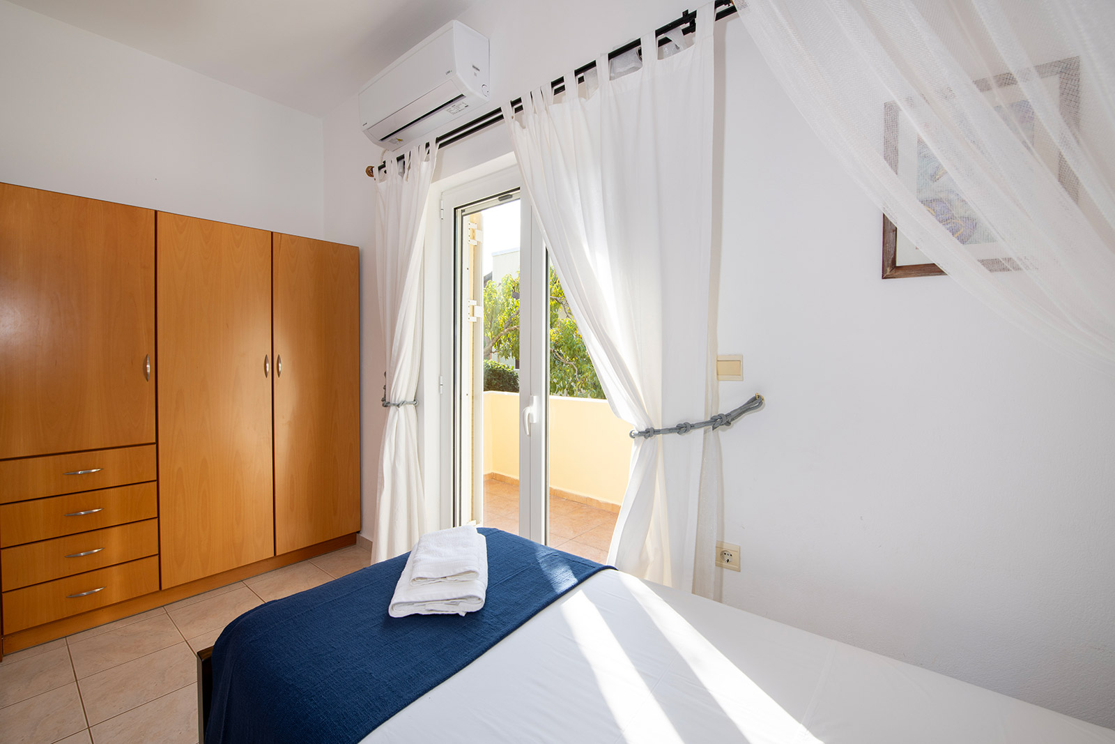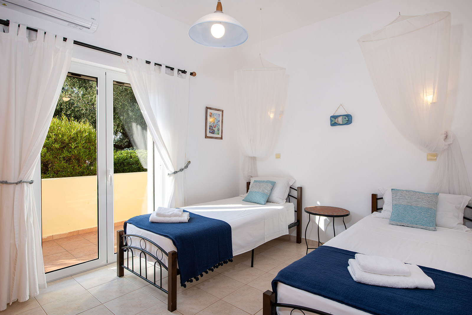 Villa Irine features two elegantly appointed bedrooms on the ground floor, designed for comfort and relaxation. One bedroom boasts a cozy double bed, while the other is furnished with two single beds, making it ideal for families or groups. Both rooms open up to private balconies, offering serene views of the surrounding olive groves. These peaceful spaces invite you to unwind and enjoy the natural beauty of Crete from the comfort of your room.