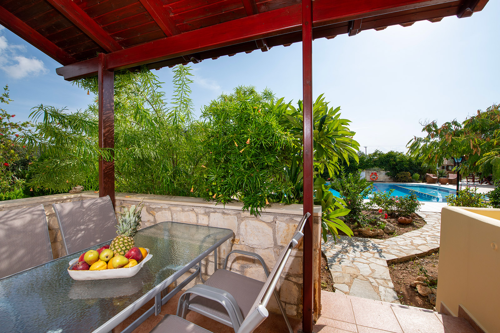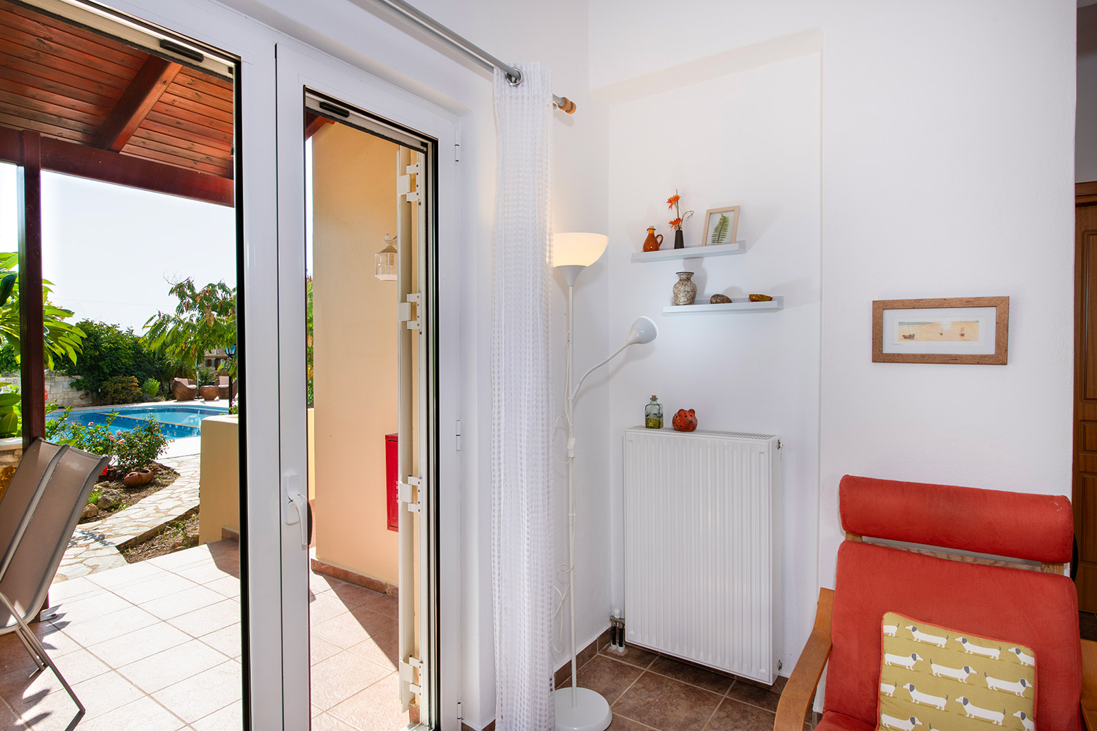 Step inside and be captivated by the panoramic vistas that surround you. With large windows and balcony doors framing the breathtaking scenery, every room of the villa offers a stunning view of Crete’s natural beauty. Whether you’re lounging in the living room or dining with loved ones, the expansive views create a serene atmosphere, making your stay even more memorable.