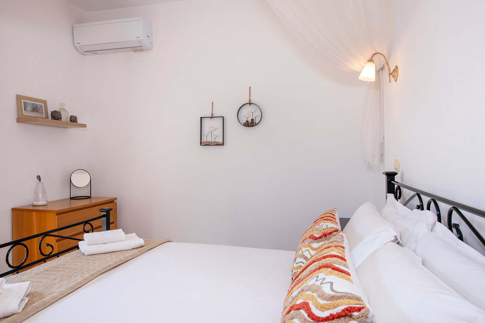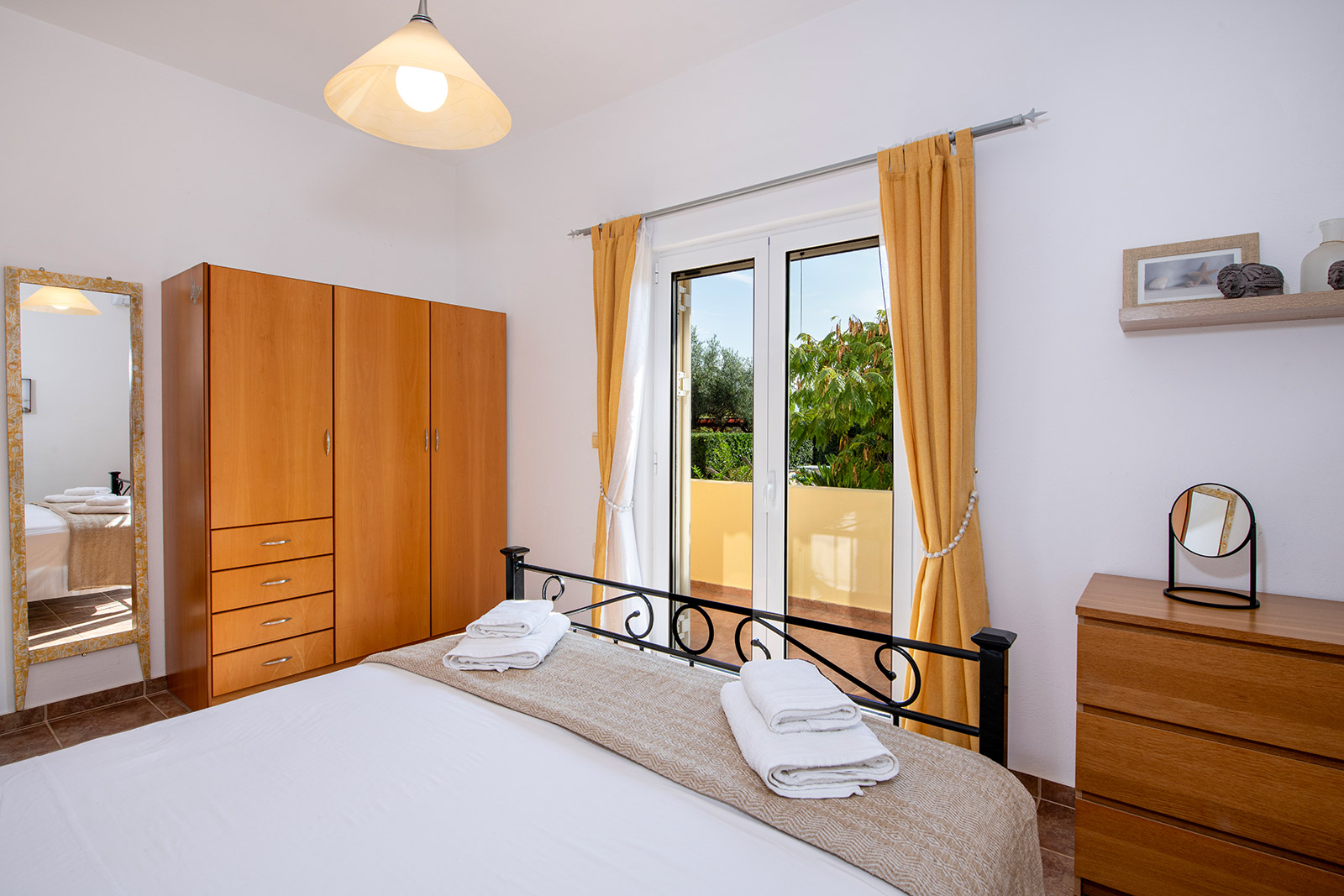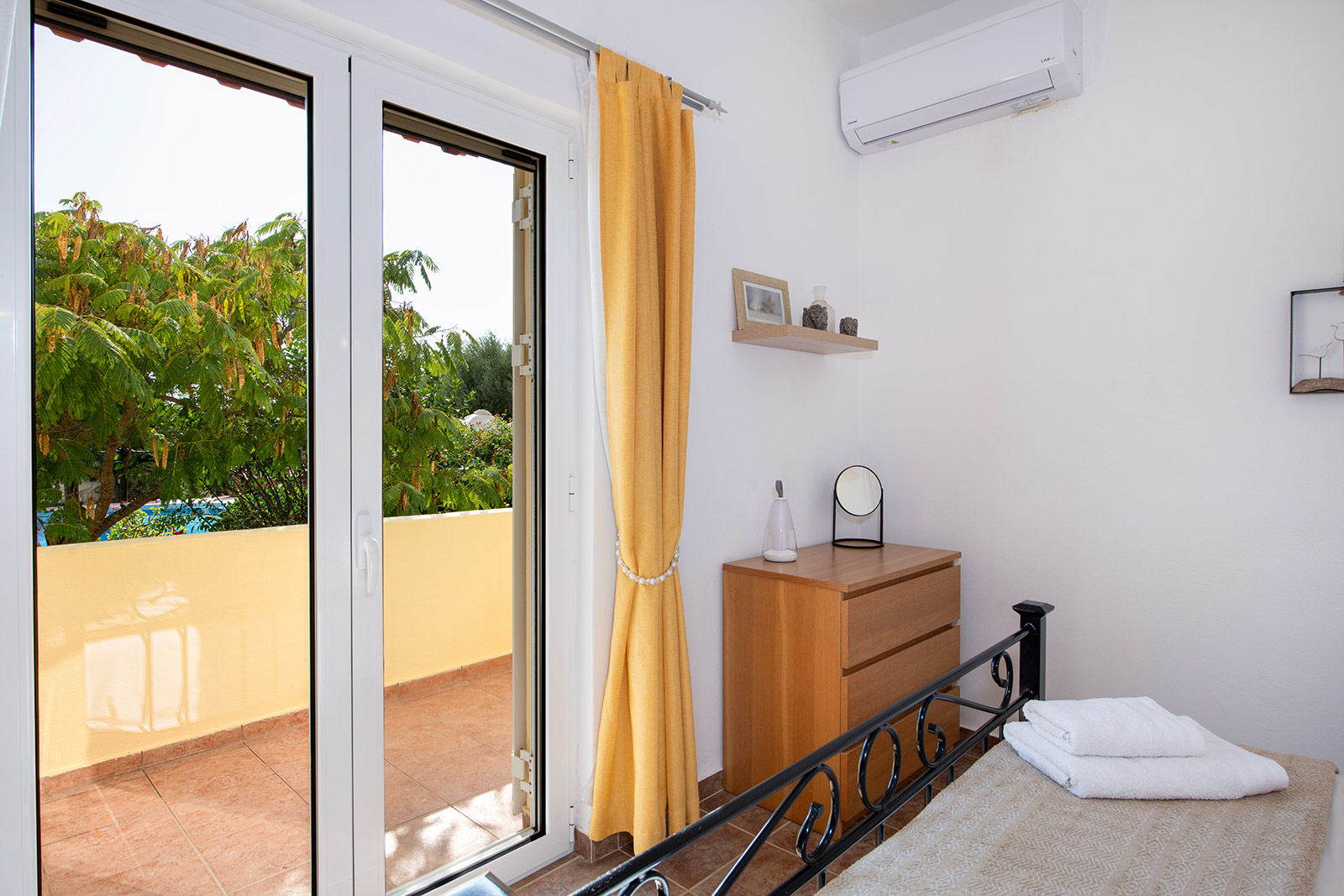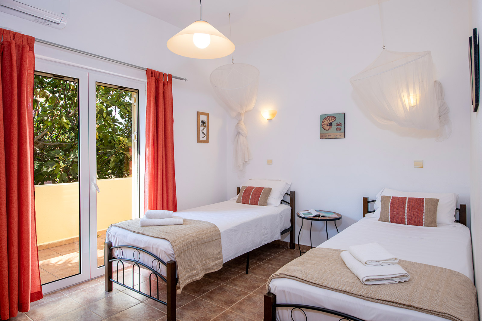 Villa Maria features two elegantly appointed bedrooms on the ground floor, designed for comfort and relaxation. One bedroom boasts a cozy double bed, while the other is furnished with two single beds, making it ideal for families or groups. Both rooms open up to private balconies, offering serene views of the surrounding olive groves. These peaceful spaces invite you to unwind and enjoy the natural beauty of Crete from the comfort of your room.