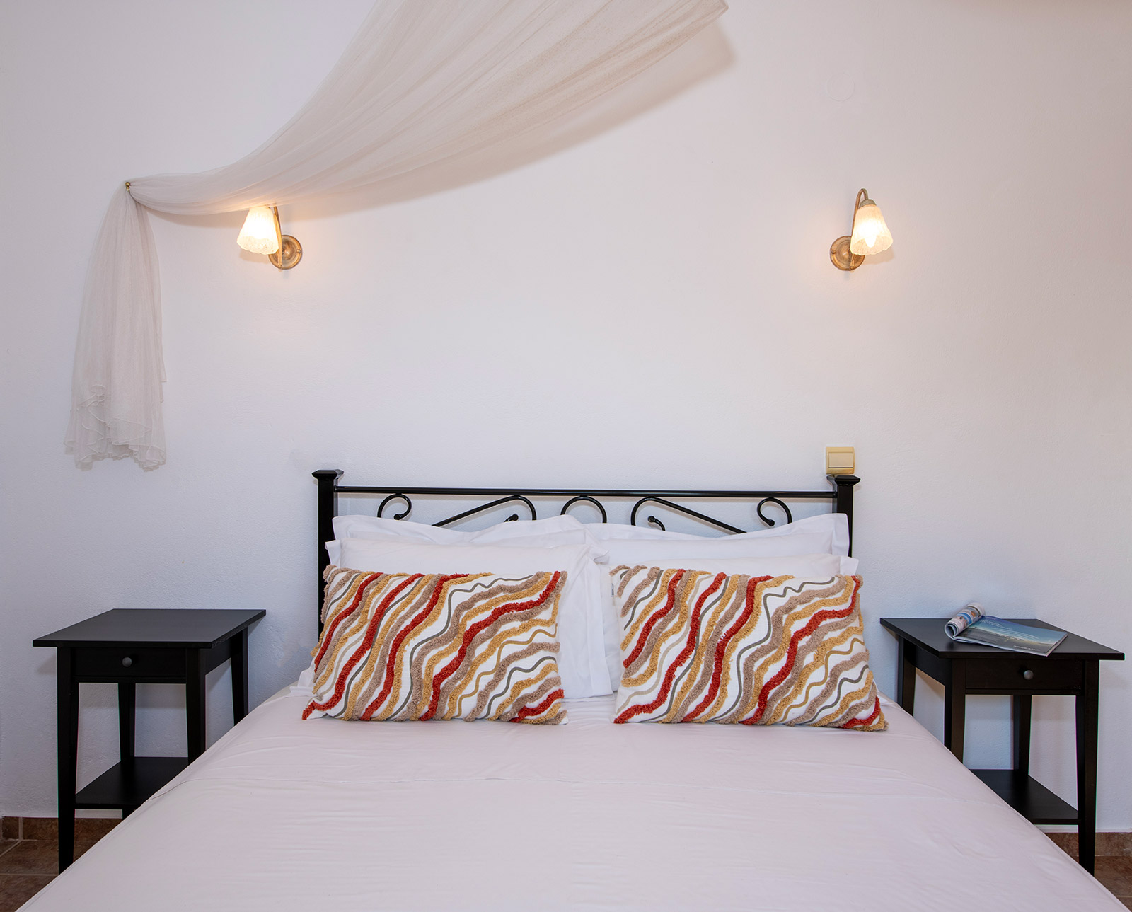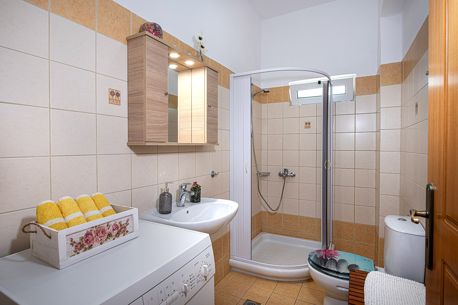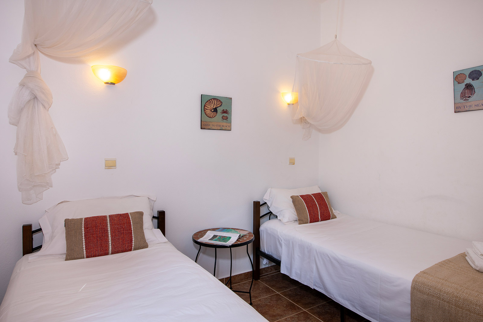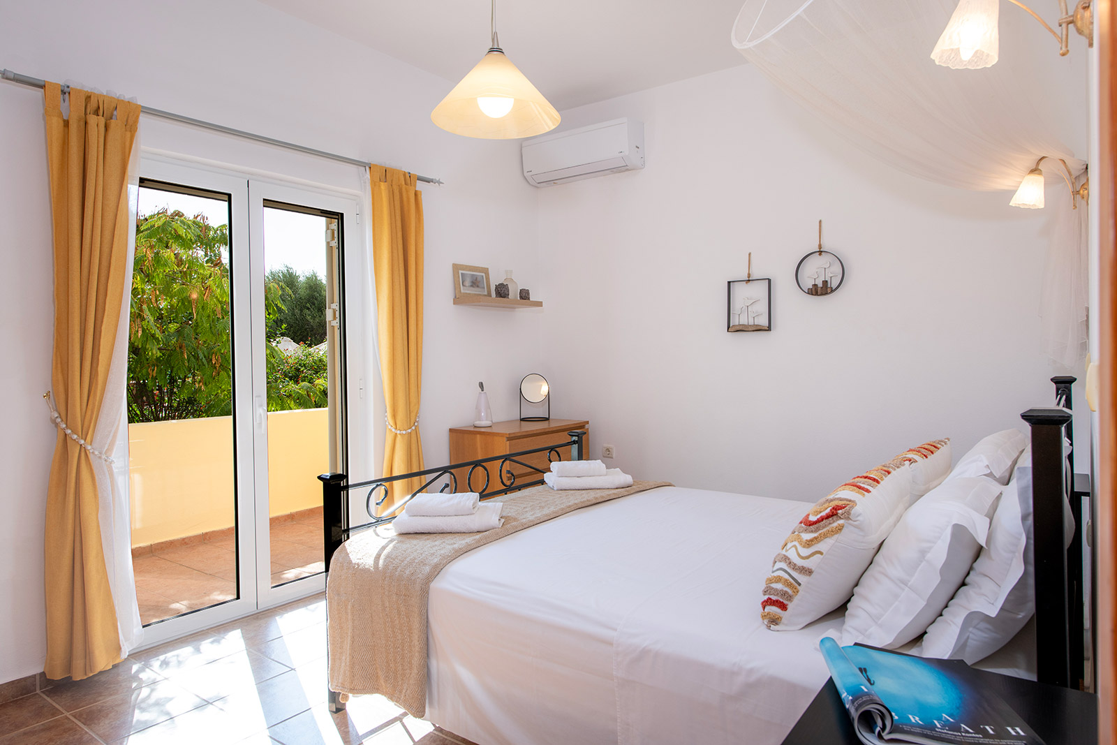 Villa Maria features two elegantly appointed bedrooms on the ground floor, designed for comfort and relaxation. One bedroom boasts a cozy double bed, while the other is furnished with two single beds, making it ideal for families or groups. Both rooms open up to private balconies, offering serene views of the surrounding olive groves. These peaceful spaces invite you to unwind and enjoy the natural beauty of Crete from the comfort of your room.